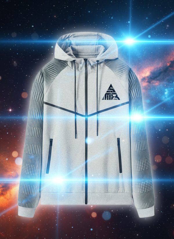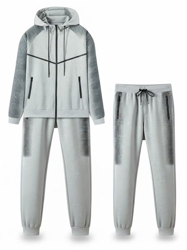 Step into your next workout with the dynamic Pixel Grid Athletic Full-Zip Hoodie. This contemporary jacket is engineered for performance and stands out with its unique, eye-catching design. The body is constructed from a versatile Heather Grey performance knit, while the sleeves feature a striking, graduated dot-matrix (pixel grid) pattern in contrasting charcoal grey.