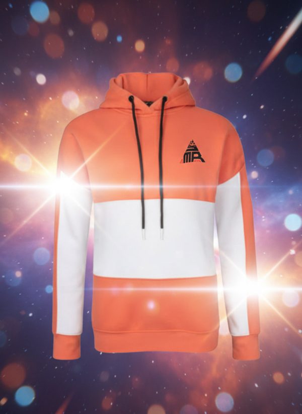 Make a striking fashion statement with The Spectrum Color Block Pullover Hoodie. This dynamic piece features a modern three-panel color block design combining a vibrant Coral/Orange hue with a crisp White horizontal stripe across the chest and sleeves. This eye-catching contrast gives the hoodie a fresh, contemporary look perfect for streetwear and casual style.